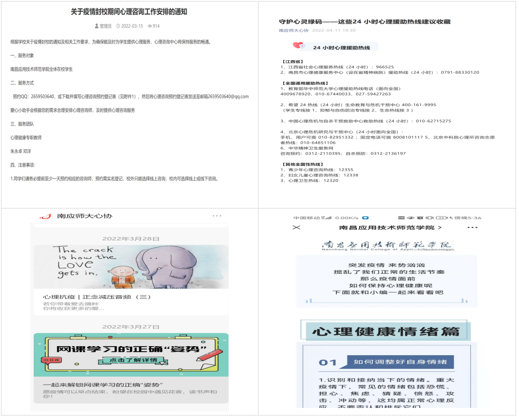 疫情发生以来,南昌应用技术师范学院在实际工作中高度重视学生心理健康教育工作,不忘初心、牢记使命,主动作为,突出重点,从心理危机预防与干预、心理抗疫讲座、心理辅导与咨询服务、心理健康排查、心理健康教育活动等方面,全方位、多角度地加强疫情期间大学生心理健康教育工作,本着“积极引导、整合资源、专业支持、精准帮扶”的原则,着力引导全体学生正确认识疫情、科学应对疫情、保持阳光健康的心态,为全面打赢疫情防控阻击战提供了坚实的心理保障。