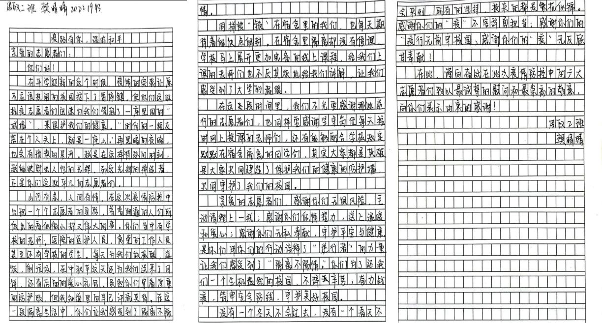 9月28日,我院举办了“疫路有你,温暖相行”写信活动。活动以写给防疫志愿者们一封信来进行开展,围绕此次志愿者们的辛勤付出,讲述志愿者们的感人故事,深情讴歌他们的自我奉献和抗疫精神。