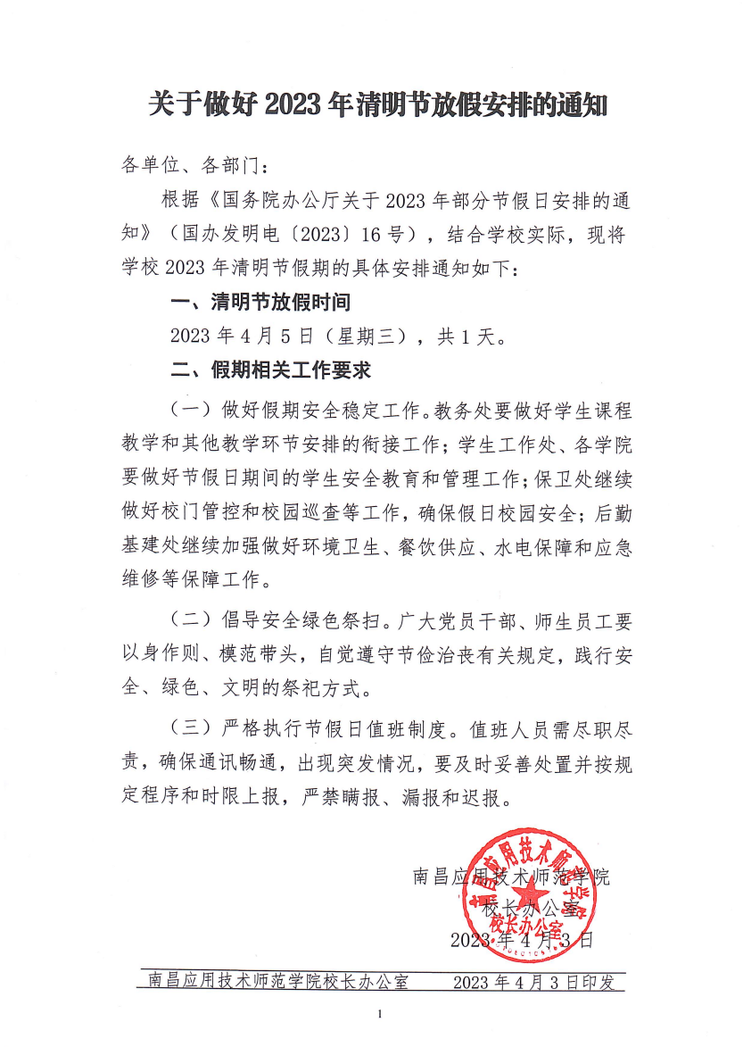 教学管理 学院新闻 学院公告 学院相册 您现在的位置是:首页 > 教学管理 > 学院公告 关于做好 2023 年清明节放假安排的通知 管理员2023-04-041347 上一篇 关于将朱子健等13位同志进行入党积极分子备案的报告