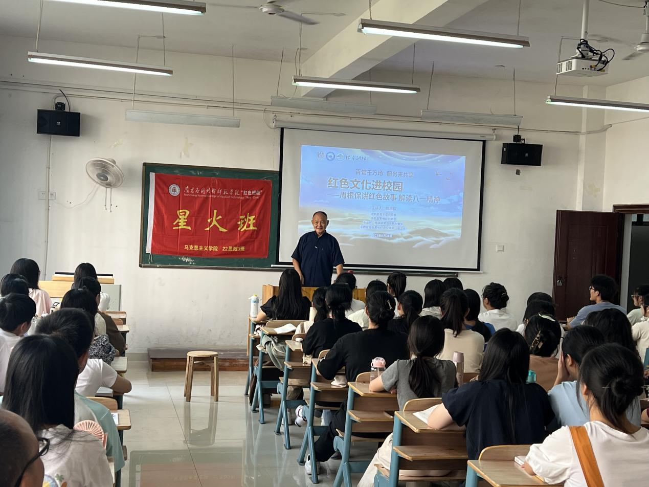为进一步加强我院学生思想政治教育,引导我院学生坚定文化自信,激发爱国主义情感,在国庆节来临之际,9月28日,日韩中文字幕亚洲中出内射特邀请中共南昌市委原常委、南昌军分区原司令员、南昌八一精神研究会原执行会长、江西省红色文化研究会原第一副会长周根保走进我院2022级思政专业3班——红色班级“星火班”,在教学楼2101教室开展了一场以“红色文化进校园——周根保讲红色故事 解读八一精神”为主题的红色宣讲活动。院长文道贵,党总支书记张欣康,“星火班”班级辅导员康柠及“星火”班全体同学聆听宣讲报告。