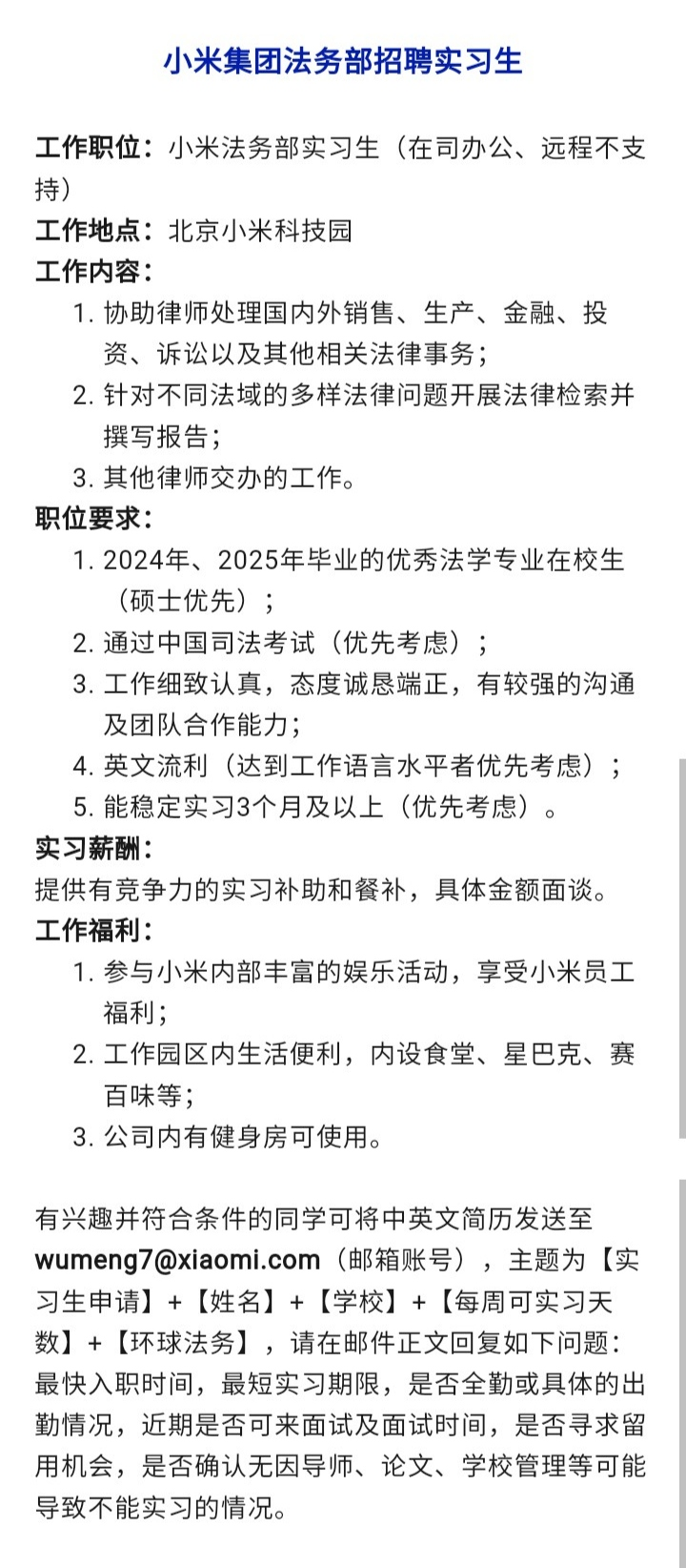 有兴趣并符合条件的同学可将中英文简历发送至wumeng7@xiaomi.com(邮箱账号),主题为【实习生申请】+【姓名】+【学校】+【每周可实习天数】+【环球法务】,请在邮件正文回复如下问题:最快入职时间,最短实习期限,是否全勤或具体的出勤情况,近期是否可来面试及面试时间,是否寻求留用机会,是否确认无因导师、论文、学校管理等可能导致不能实习的情况。