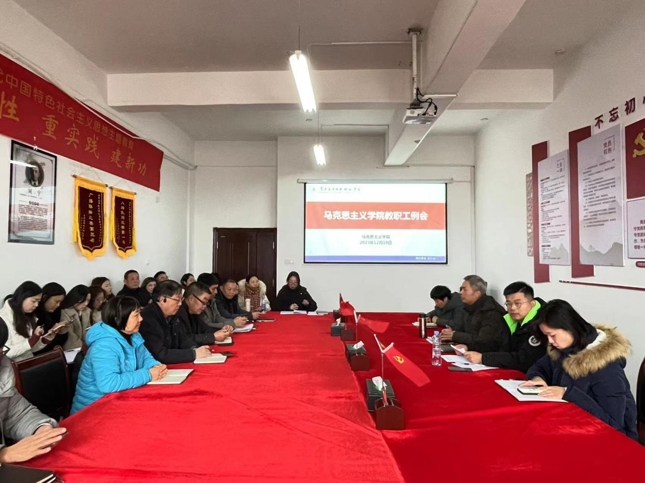 12月19日下午,学院在1511会议室召开全体教职工工作例会,院长文道贵,党总支书记张欣康,党总支副书记李婷、副院长张丹及学院全体教职工参加会议,会议由院长文道贵主持。