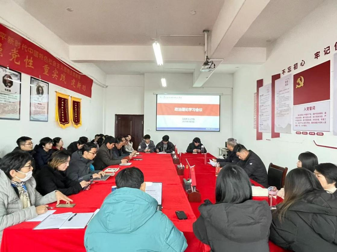 3月5日下午,学院在1511会议室召开政治理论学习会议。院长文道贵,党总支书记张欣康,党总支副书记李婷、副院长张丹及全体教职工参加此次会议,会议由张欣康主持。