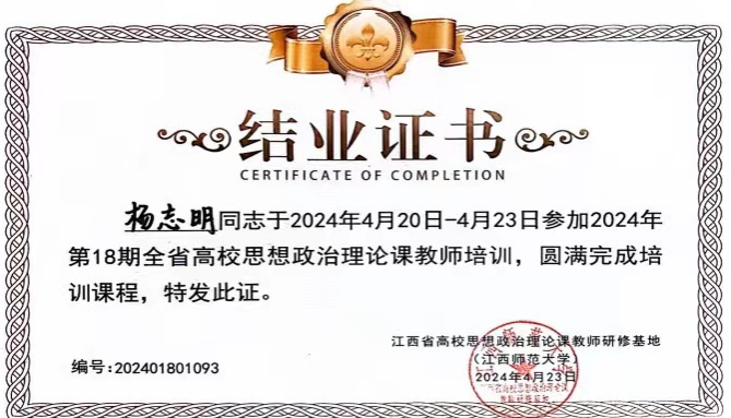 自从教以来,他致力于课程建设和教学改革,依托《习近平新时代中国特色社会主义思想概论》课程,主持南昌市社会科学规划项目课题1项,积极参与江西省社科的课题申报工作,在重要刊物发表多篇学术论文。
