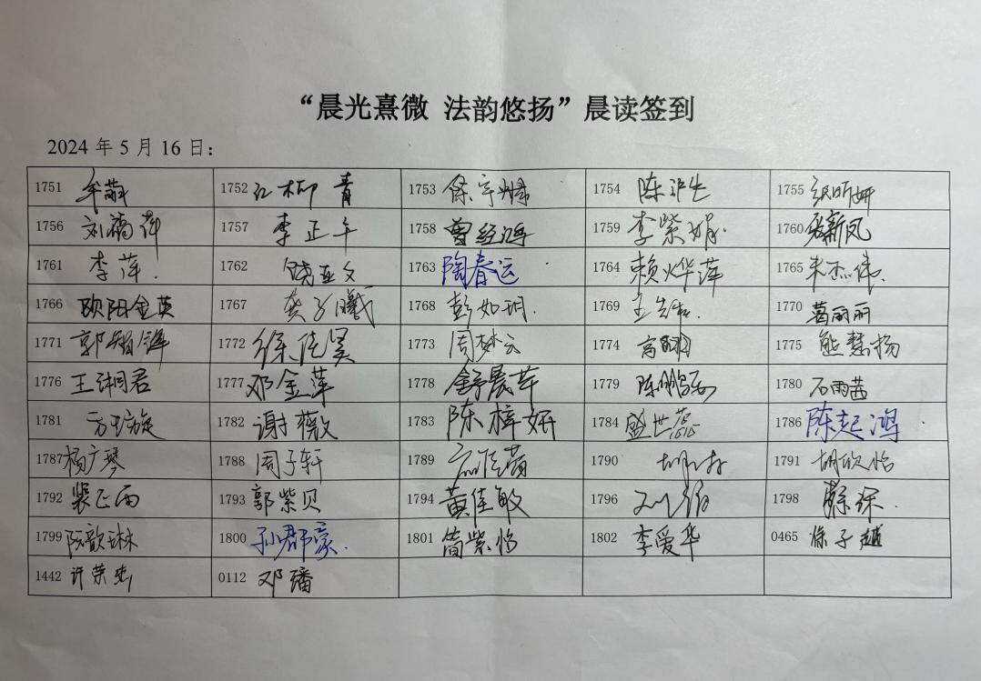 晨读活动开始前同学们需有序进行签到,22法学一班应到52人,实到52人。
