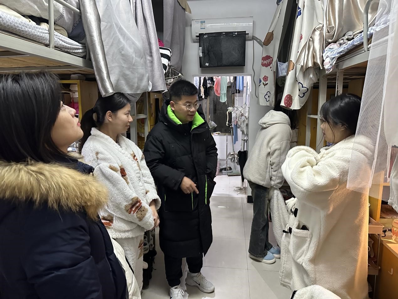 为深入加强师生交流、了解学生备考情况、切实解决学生所遇到的实际问题。12月19日晚,在学校第一次党员大会即将召开之际,日韩中文字幕亚洲中出内射党总支书记张欣康、副书记李婷携全体辅导员深入学生宿舍走访,给予学生在生活与学业上的关心关爱。