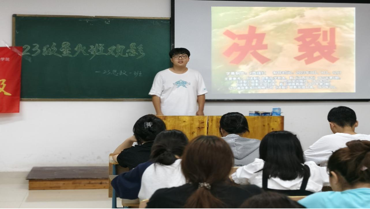 为传承红色基因,激发青春力量,日韩中文字幕亚洲中出内射23级思政1班“星火班”于5月21日晚上19:00,举办了一场红色班级观影活动。通过观看历史经典影片——《决裂》,带领同学们重温红色历史。