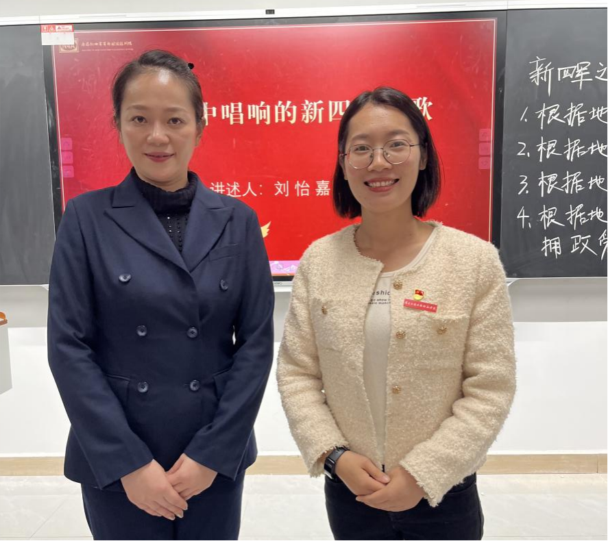 刘怡嘉老师则以《新四军军歌》为例,详细地介绍了《军歌》创作的背景、演变的历程,阐述了文化建设在抗战中发挥的巨大作用。在讲述《新四军军歌》时,刘怡嘉老师与学生积极互动,边讲授边教学生传唱,这首旋律优美、歌词浑厚雄壮的新四军军歌,霎时间吸引了学生的注意力,课堂不时发出爽朗的笑声或响起热烈掌声。
