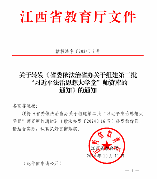 近日,江西省教育厅下发了《关于转发《省委依法治省办关于组建第二批“习近平法治思想大学堂”师资库的通知》(赣教法字〔2024〕8号)》的通知文件,确定了70位讲师入选全省第二批“习近平法治思想大学堂”师资库。我院副教授刘德彰成功入选。