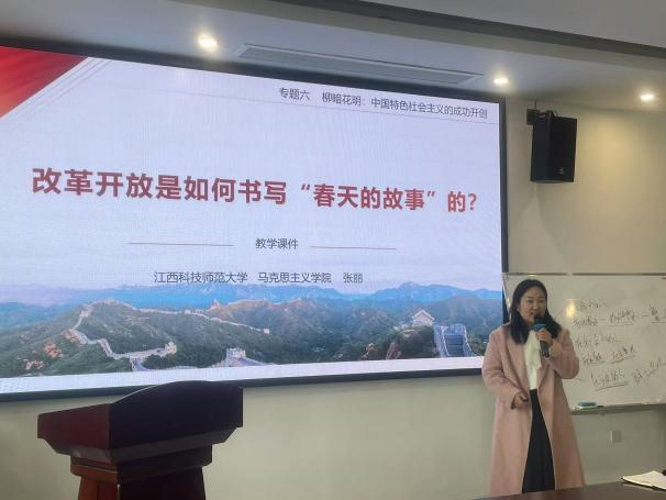 接着,省级教学成果奖获得者、江西科技师范大学马院张丽博士、青年教师郑青青分别以“改革开放是如何书写“春天的故事”的?”、“网络生活中的道德要求”为题讲授示范课。两位来访青年教师在备课准备、教学组织、AI技术手段融入课堂等环节,通过诗意的语言为我们生动地讲述了《习近平新时代中国特色社会主义思想概论》《思想道德修养与法治》精彩片段,通过主题讨论、数据分析、随堂训练、与人工智能对话等多种教学手段,为我院老师带来了一场充满互动与创新的课堂体验。