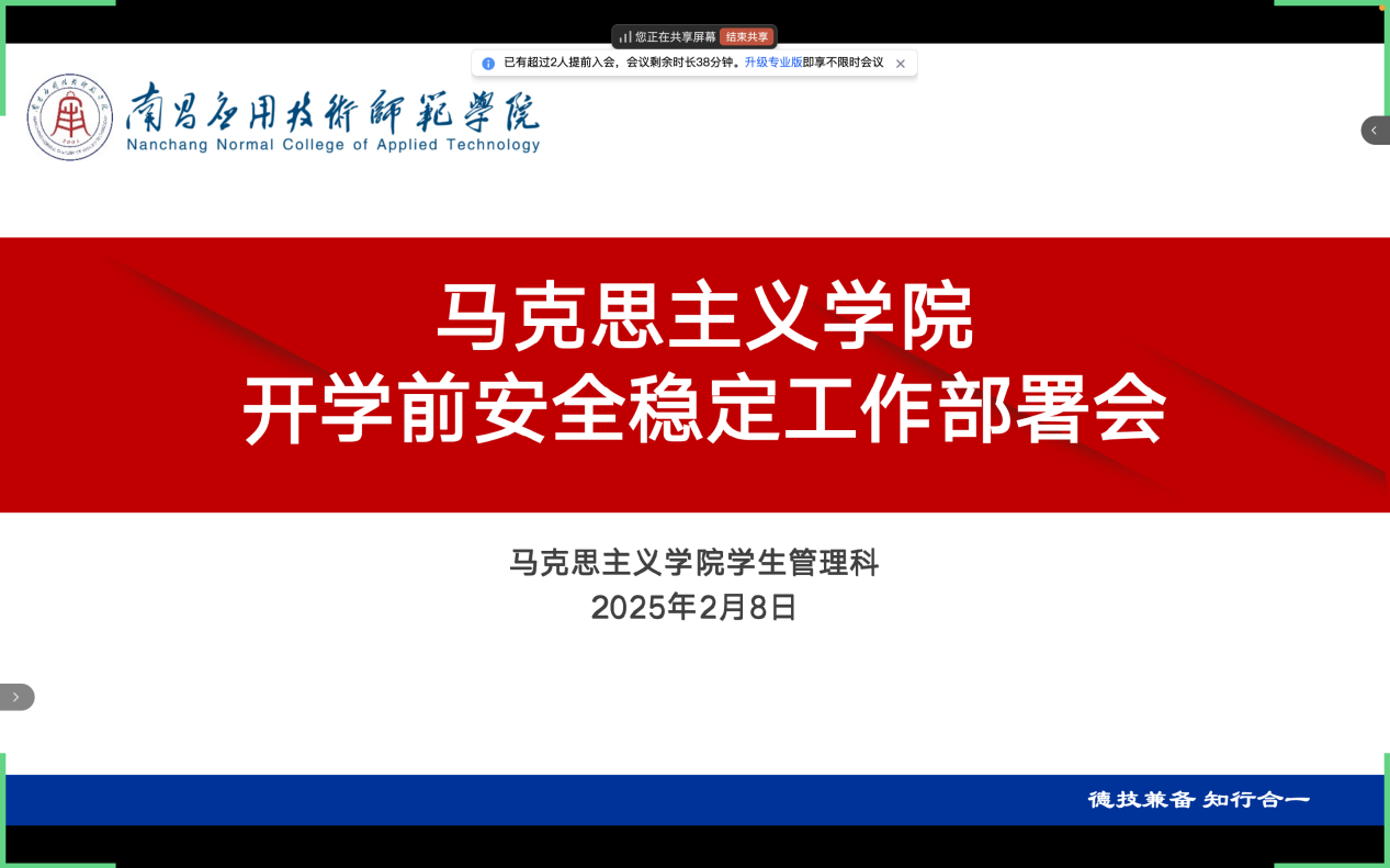 为切实做好新学期开学前的各项准备工作,确保学生安全返校,营造稳定有序的校园环境,我院于2月8日召开开学前安全稳定工作部署会,学院党总支书记张欣康、党总支副书记李婷、全体辅导员参会。