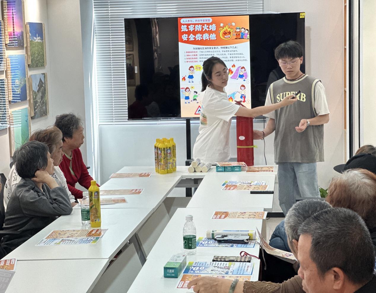 随后,我院宣讲团成员蔡艺与搭档肖明星一同针对消防安全向居民开展情景式讲解。他们向独居老人介绍在家用火用电时需要注意的一些安全事项,随后向社区居民展示如何正确使用灭火器及如何正确逃生,通过宣讲进一步普及消防安全知识,增强居民的安全意识。