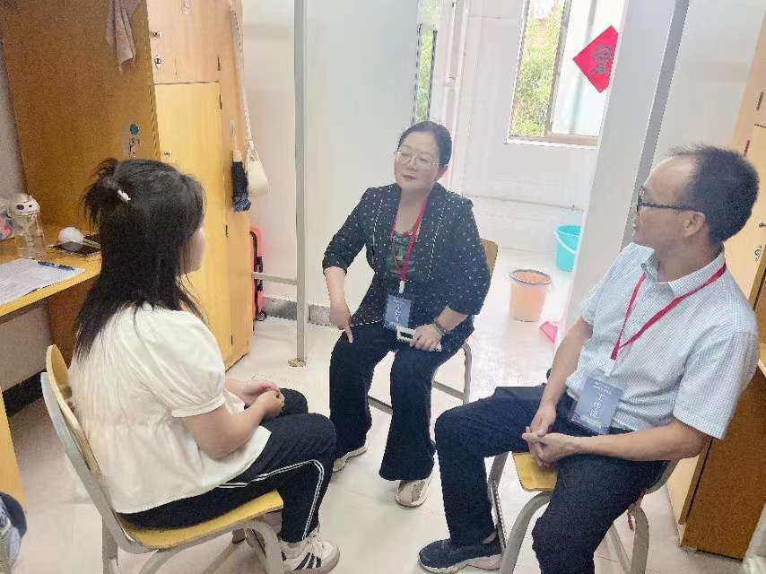 (图为校党委书记、党务副书记与新生交流)